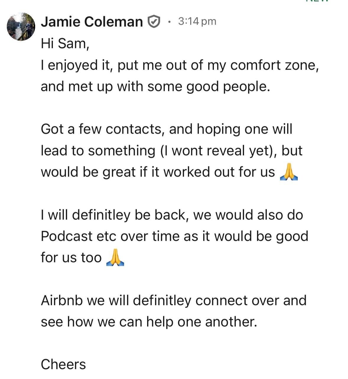 "I enjoyed it, put me out of my comfort zone, and met up with some good people. Got a few contacts, and hoping one will lead to something..."
